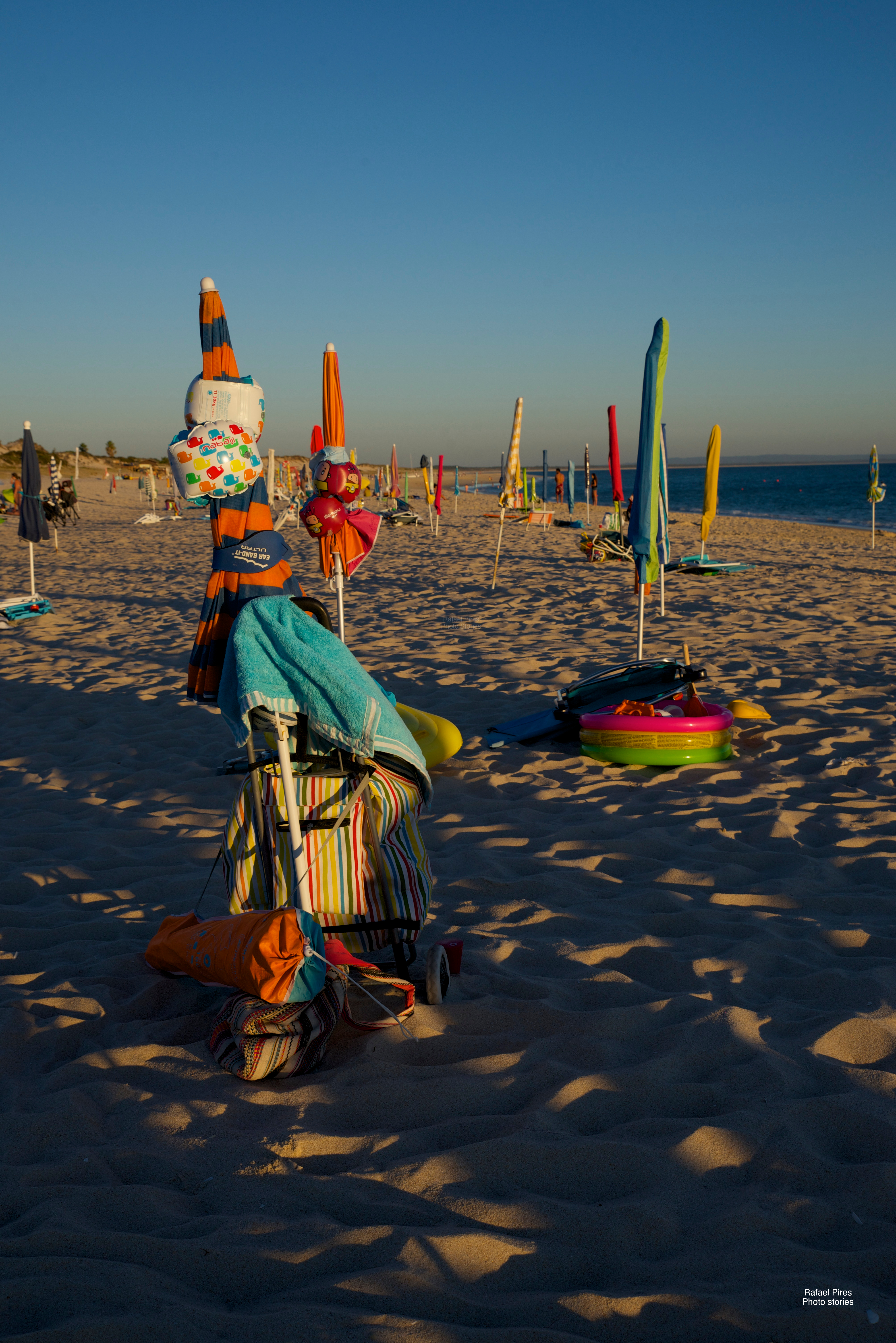 Boats docked at the fishing harbour in Cova do Vapor. Some are docked with ropes, so people can pull them.
